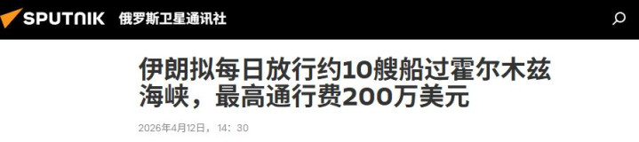 俄罗斯卫星通讯社2026年4月12日伊朗拟每日放行约10艘船过霍尔木兹海峡,最高通行费200万美元