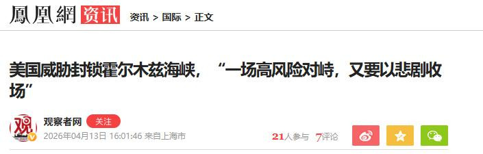 观察者网2026年04月13日美国威胁封锁霍尔木兹海峡,“一场高风险对峙,又要以悲剧收场”