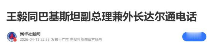新华社新闻2026-04-13王毅同巴基斯坦副总理兼外长达尔通电话